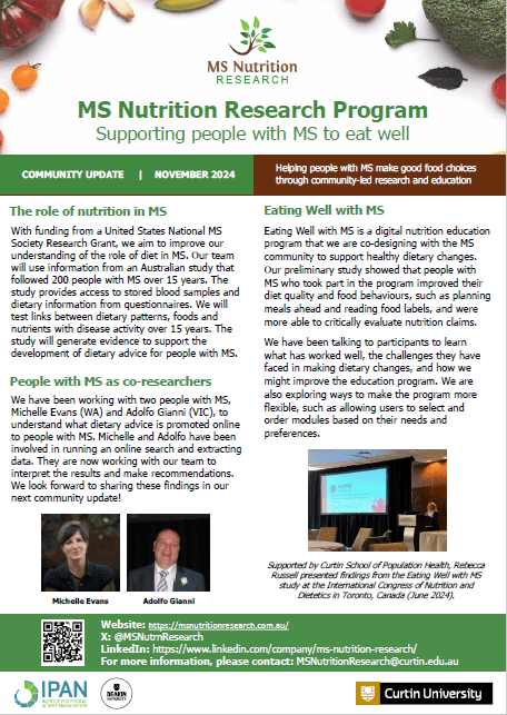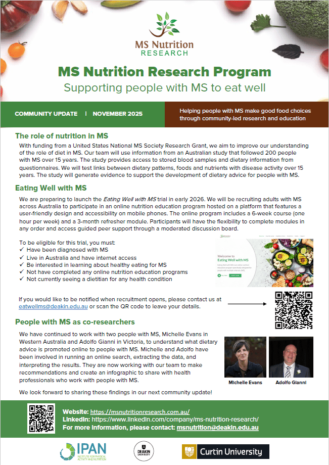 Established in 2025, our Lived Experience Advisory Panel is a group of people living with MS and family members of people with MS. The panel members provide their personal expertise to help share our researchh project to test the effectiveness of our digital nutrition education program, Eating Well with MS. The panels members provide guidance on the design of the project, the content of the program, the associated study materials, recruitment strategies and how best to share our findings with the MS community. The Lived Experience Advisory Panel ensures that our research project meets the values and needs of people with MS and the broader MS community.
